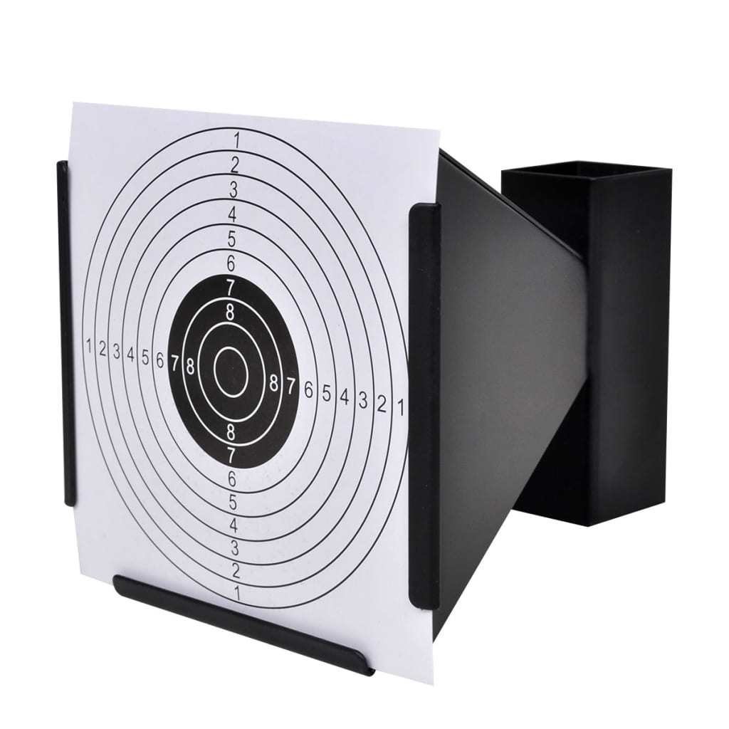 This funnel pellet trap can be used either free standing or attached to a post or wall. Delivery also includes a pack of 100 x 5.5" paper targets.Material: SteelDimensions: 5.7" x 7" x 5.5" (L x W x H)Holds 5.5" paper targetsAutomatically catches pelletsCan be attached to a post/wall or used free-standing