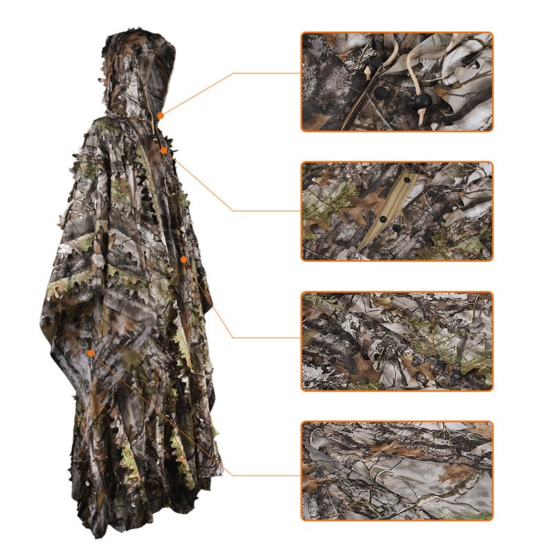 1.Breathable and Comforable - The Ghillie Poncho Suits is made from polyester,it's quite breathable and comfortable.Feels very soft,and wears super light.Polyester Bionic fabric with unique 3D lifelike Tree Camo leafy design for good protection and camouflage.