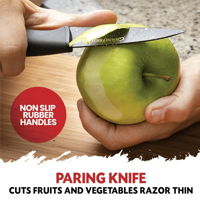 Chop, slice and dice like a pro with our new granite stone knives! These high-grade stainless-steel blades are non-stick and dishwasher safe. Prep a meal with this set of all knives with rubberized handles for comfort and easy grip. Once you are finished just pop them in the dishwasher for easy clean up! Included in this set are your most important knives to get you cooking in the kitchen. Nutriblade 4pc is 9.28oz in weight.